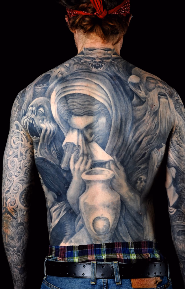 Dominick's style combines intricate detail with large-scale compositions. He draws inspiration from many tattoo styles, but loves realism, landscapes, sci-fi, vaporwave, architecture, classic paintings, and visionary psychedelic imagery.